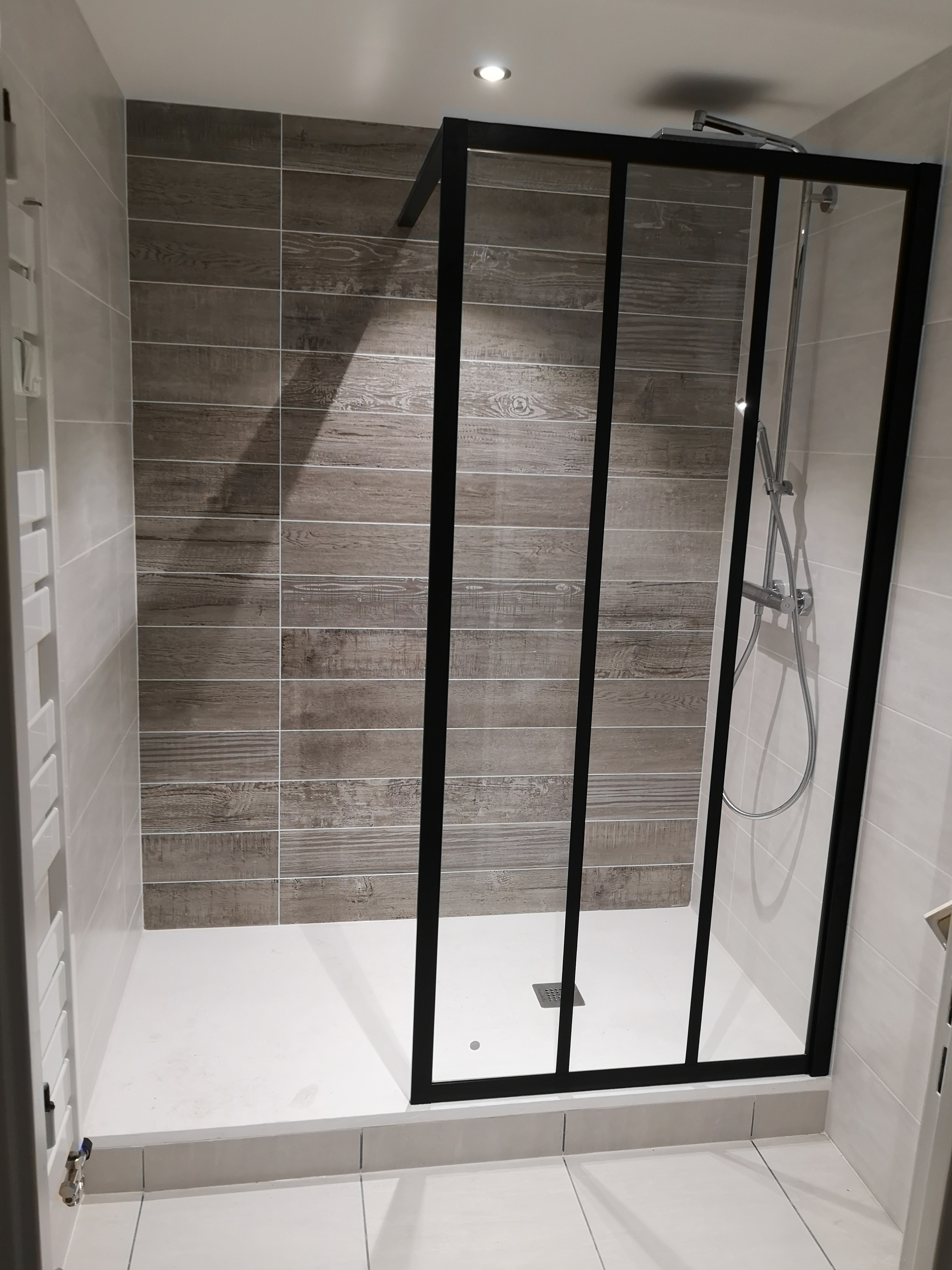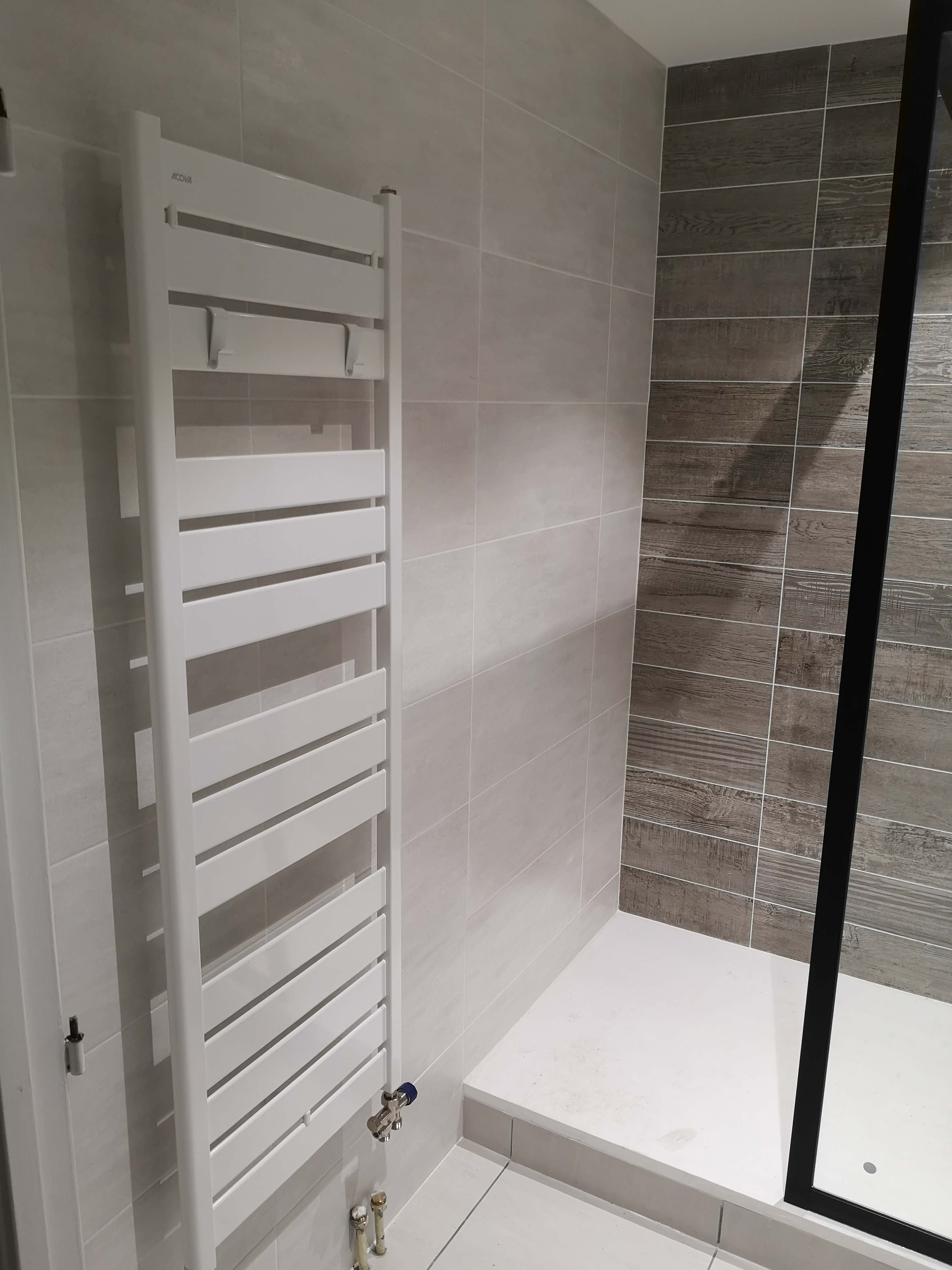 Ce receveur de douche "a l'italienne" et sa paroi de douche fixe avec un cadre noir, complété par une colonne de douche chromée et le changement du sèche serviette, redonne un coup de neuf à cette salle de bain, plus moderne et plus fonctionnelle.