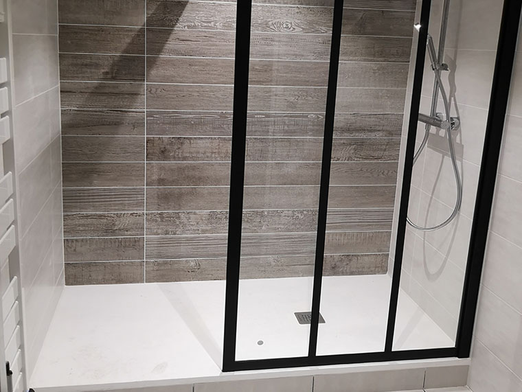 Dans le cadre d'une rénovation de la salle de bain, nous avons remplacé l'ancienne baignoire en fonte par un receveur de douche spacieux.