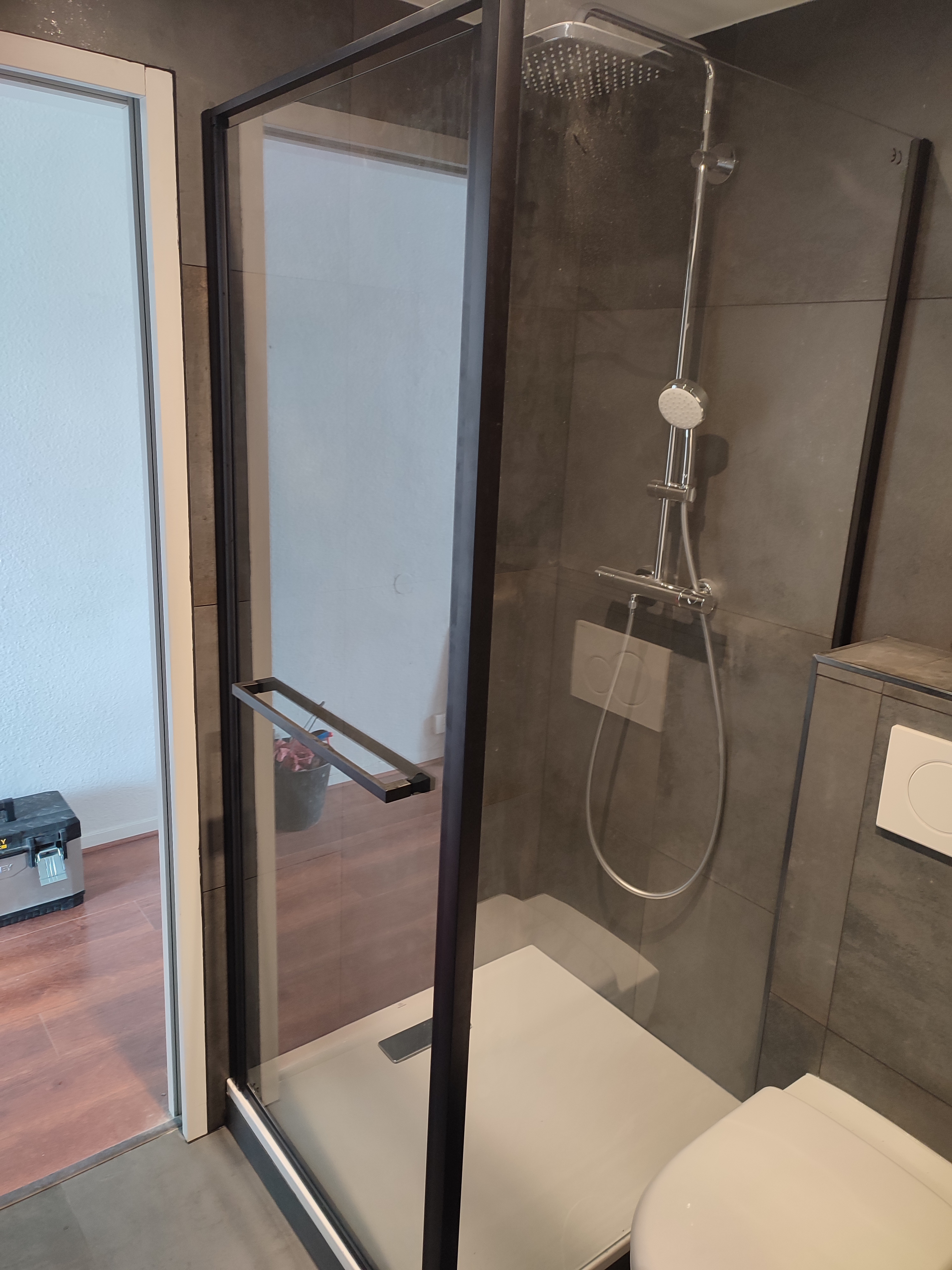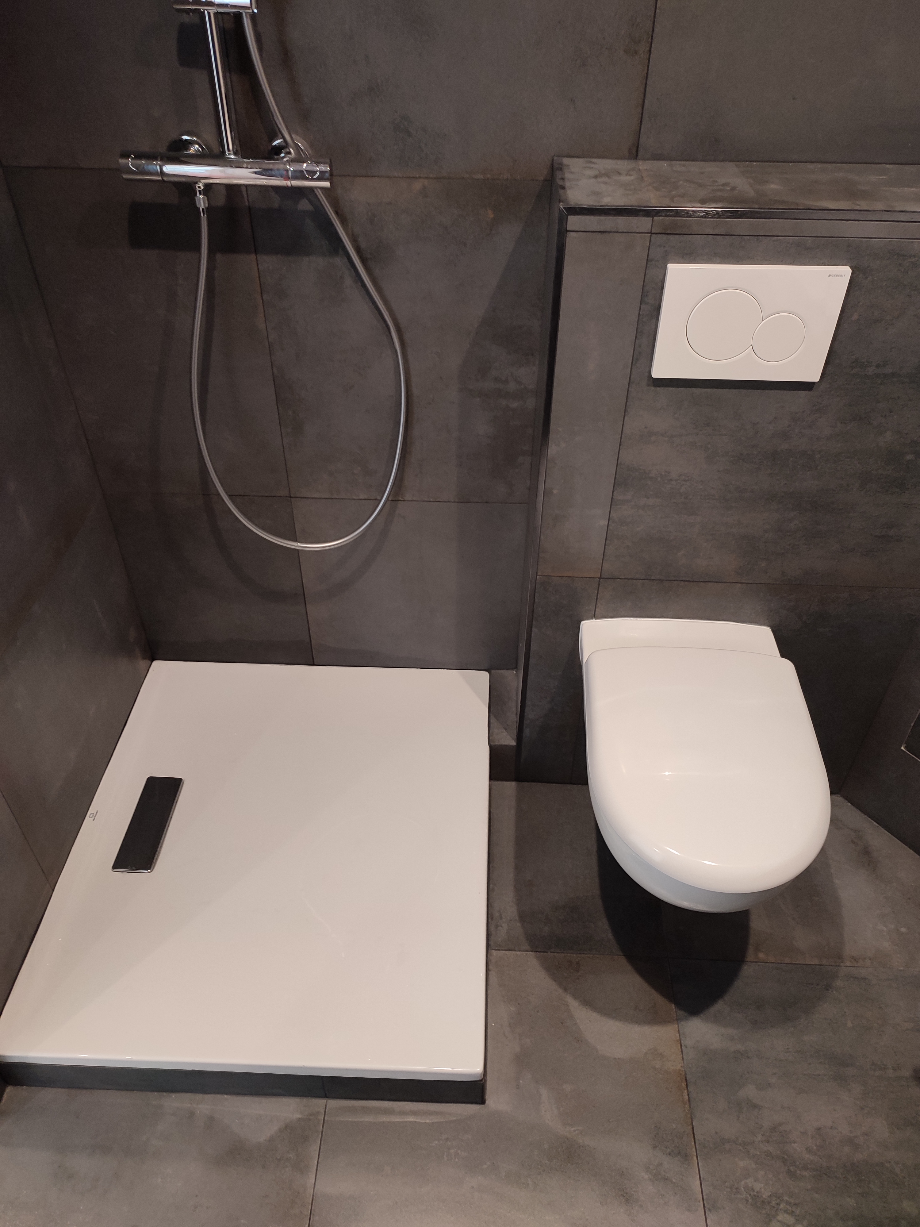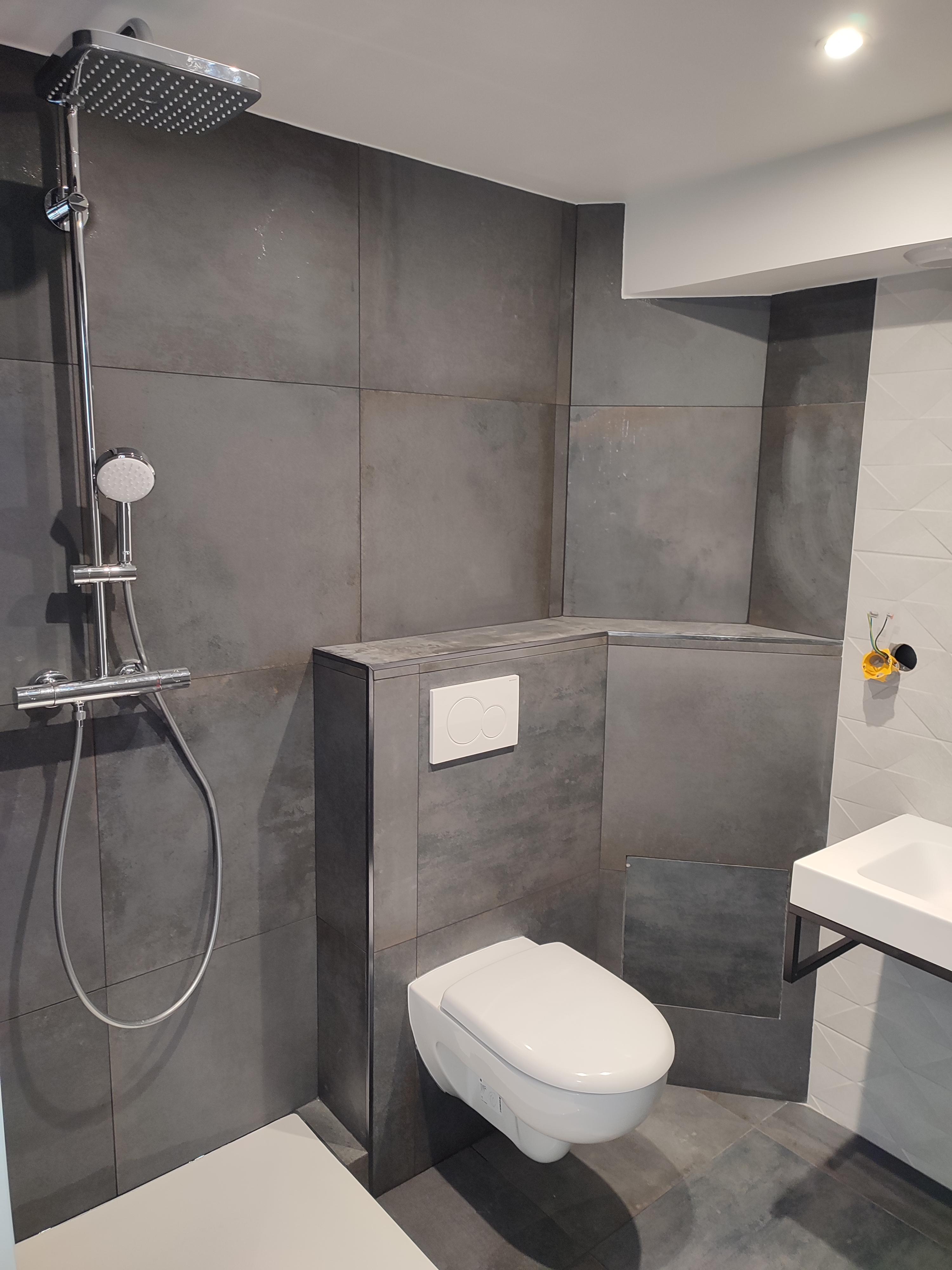 Cette rénovation repart de zéro, en effet tout a été optimisé pour que la place ne sois pas un problème dans ce petit appartement. Receveur de douche 90x80, WC suspendu et vasque suspendue. Le tout dans une ambiance moderne et chaleureuse.