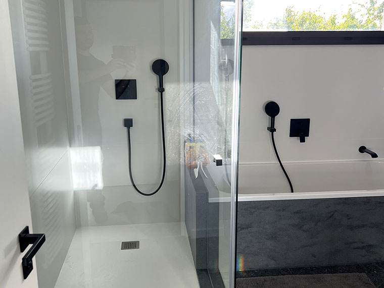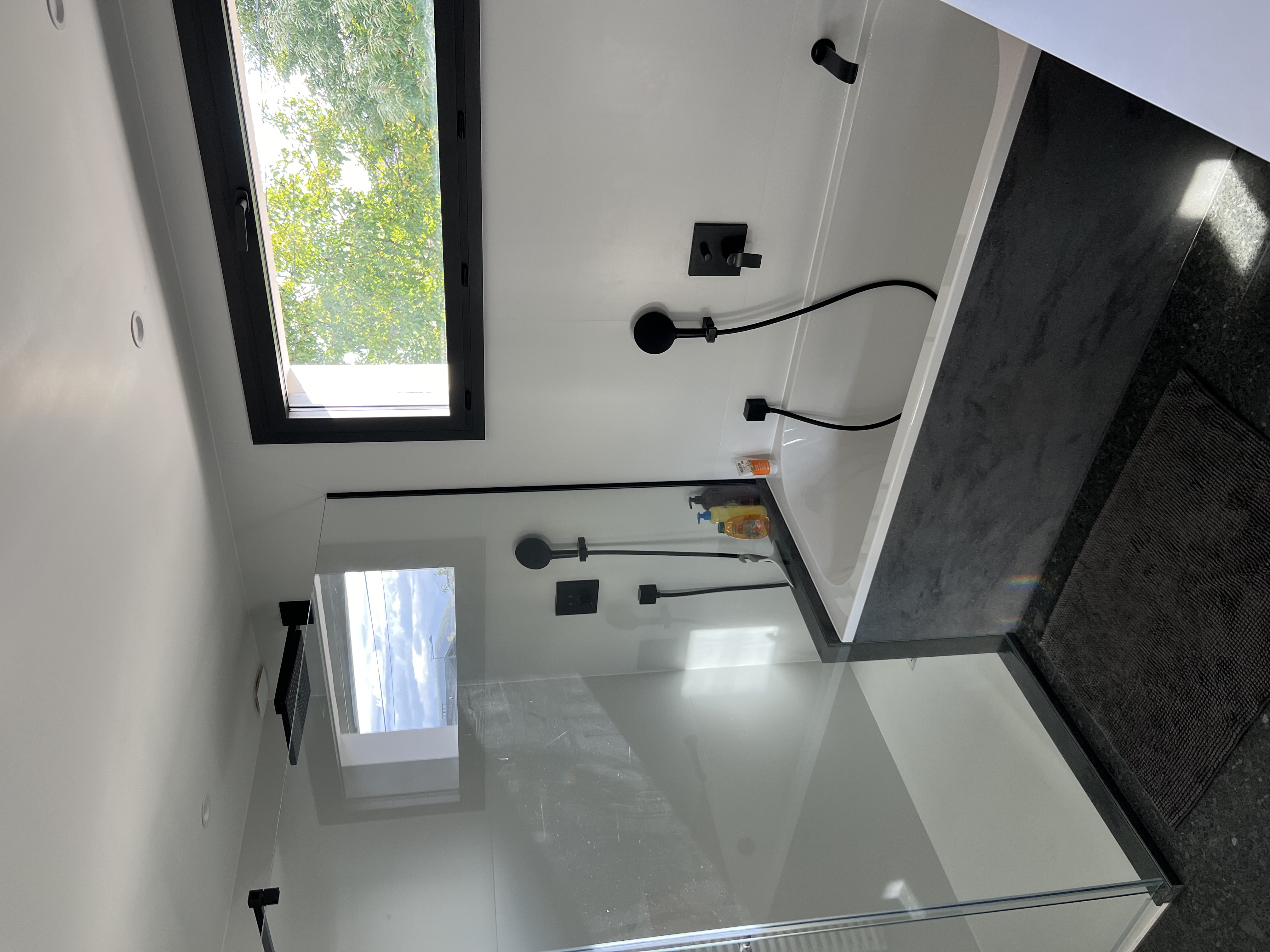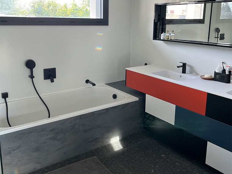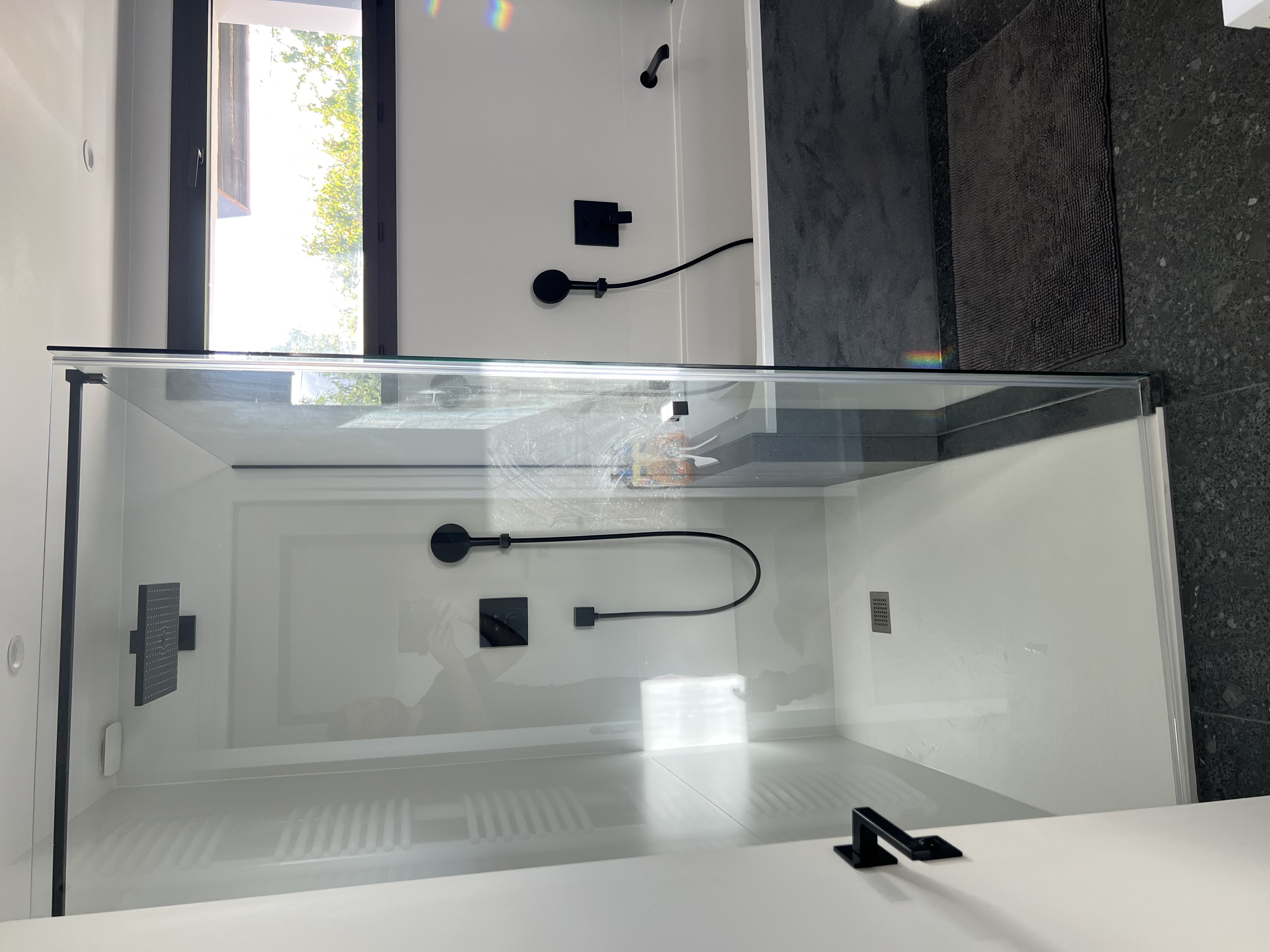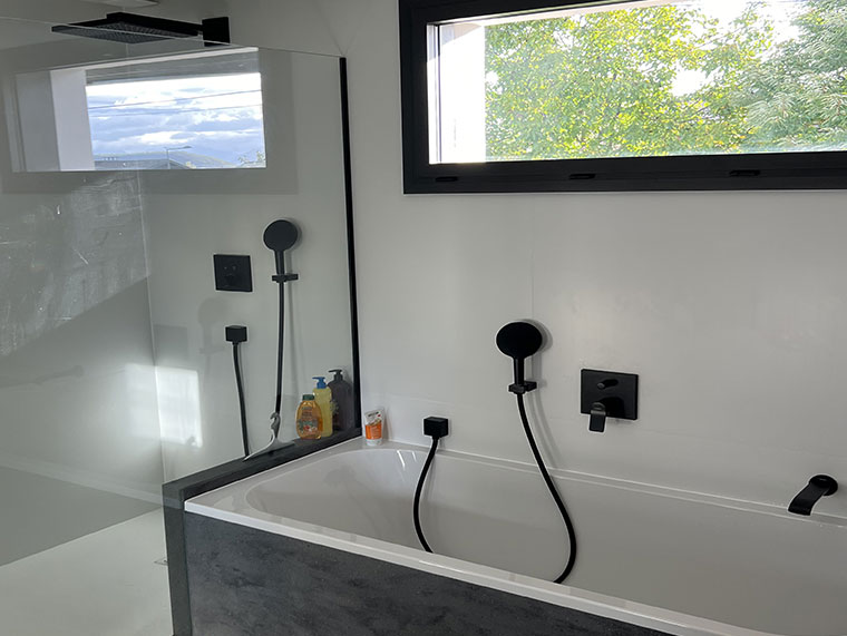 Dans cette salle de bain un espace douche et bain séparé par une vitre sur mesure. Des matériaux de qualités et modernes. La salle de bain ce complète par une vasque suspendue tendance. La robinetterie est quand à elle toute encastrée, de couleur noire mat.