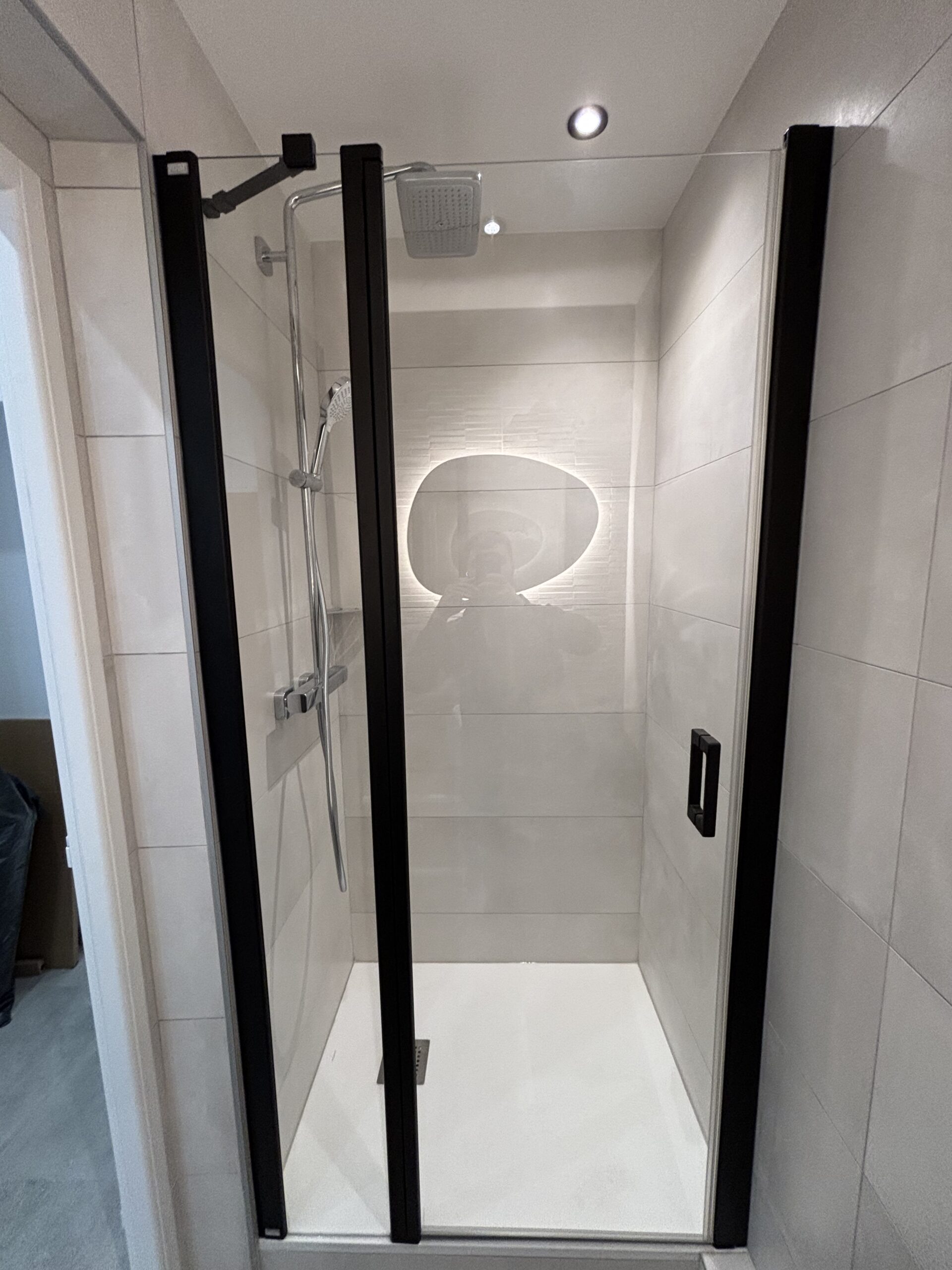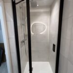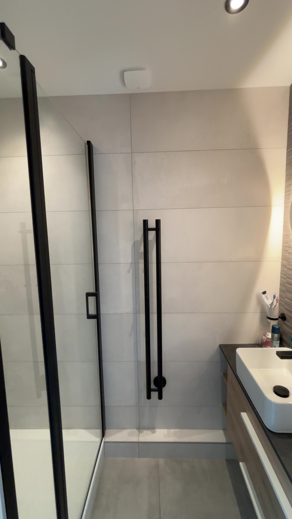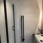 L’espace douche a été intelligemment optimisé grâce à un receveur extra-plat découpable. Le meuble vasque se compose d’un caisson standard prolongé par un plan de travail sur mesure, offrant des rangements supplémentaires appréciables. Un sèche-serviettes moderne et épuré, à la fois discret et efficace, vient compléter l’aménagement de la salle de bain.
