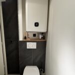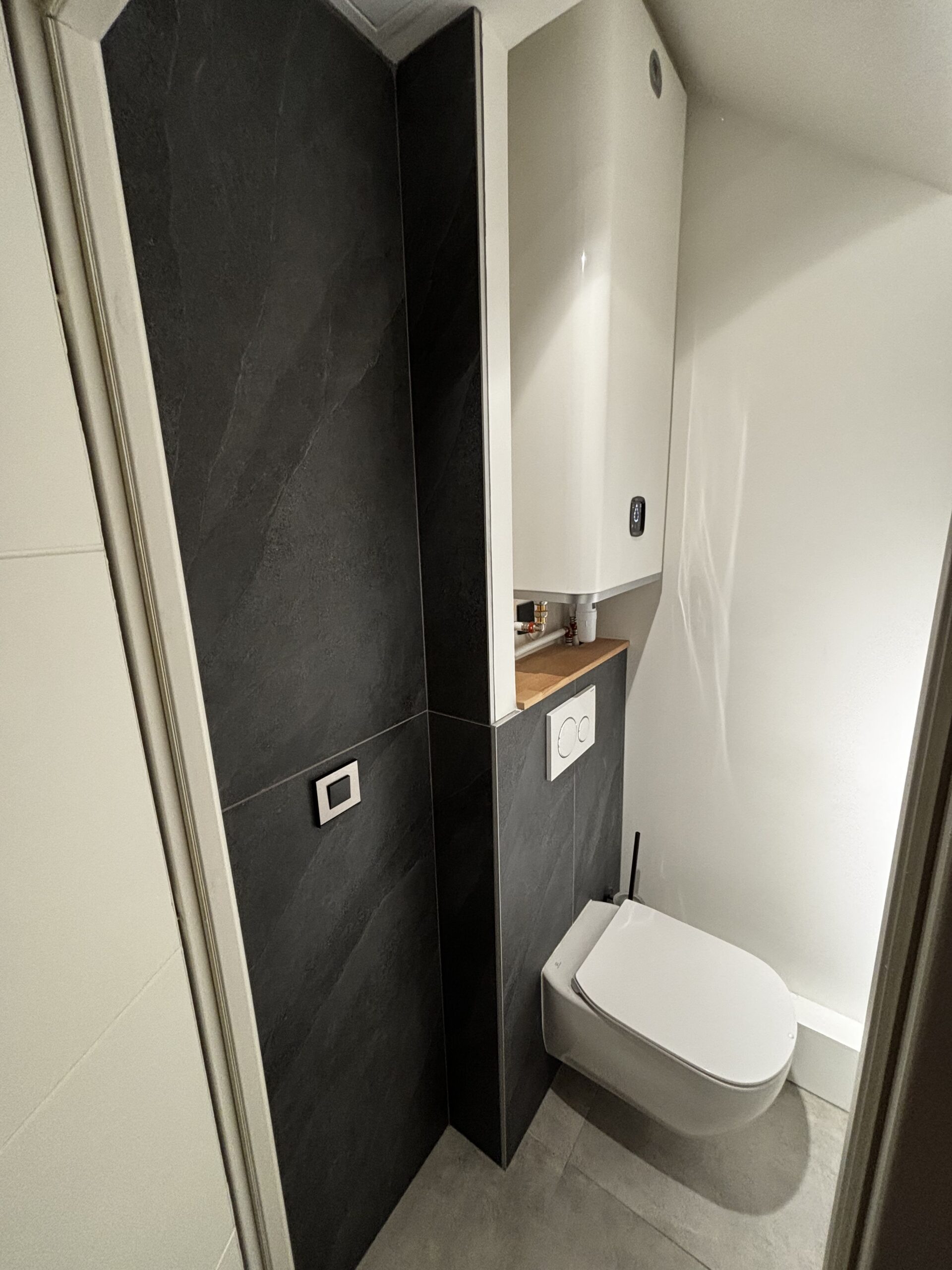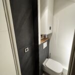 Le coin WC a également été optimisé avec l’installation d’un WC suspendu plus pratique et contemporain. Le chauffe-eau extra plat, positionné en partie haute, permet de libérer un maximum d’espace.